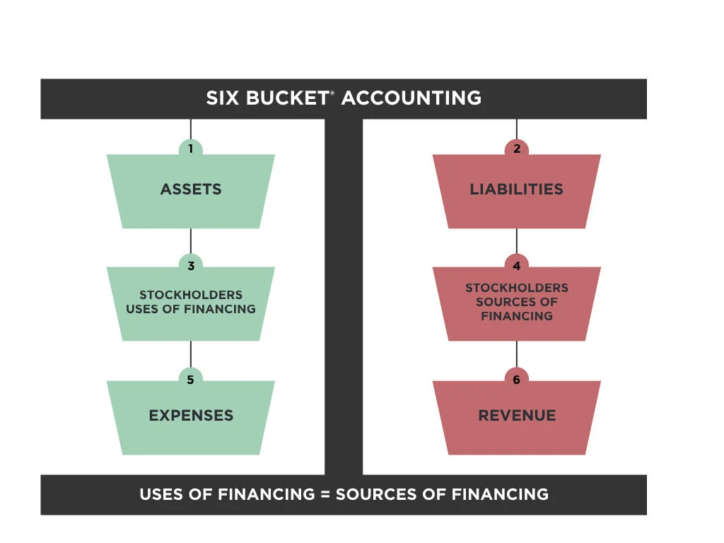 For decades now, schools have been teaching students HOW to do accounting in a complicated and unintuitive way. The Six Bucket™ method presents a simple Uses equals Sources of financing approach to teaching. All you will need is a spreadsheet application and a desire to learn accounting.
